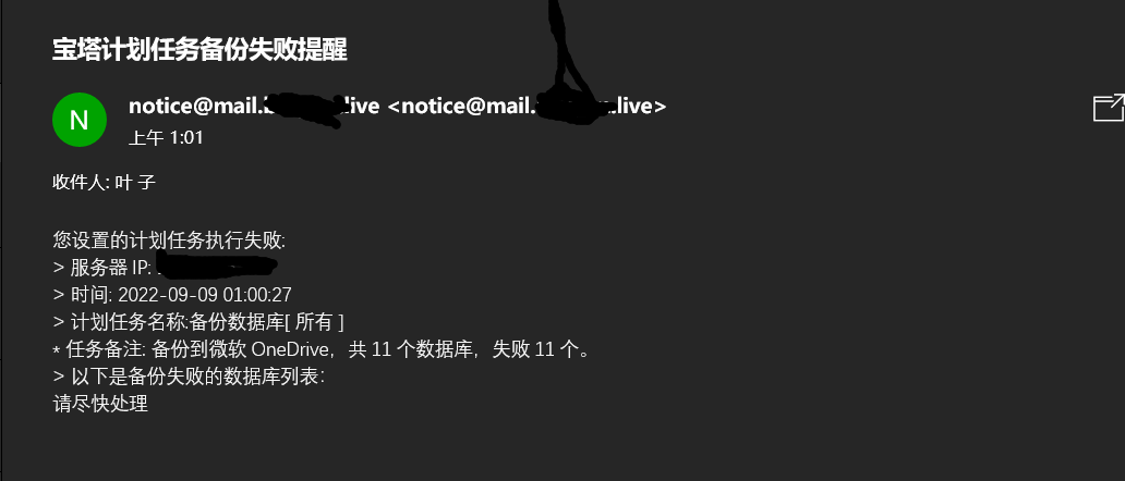 然后今天凌晨,宝塔发来通知邮件说数据库备份失败,我也没在意,因为那会MySQL正在编译安装中