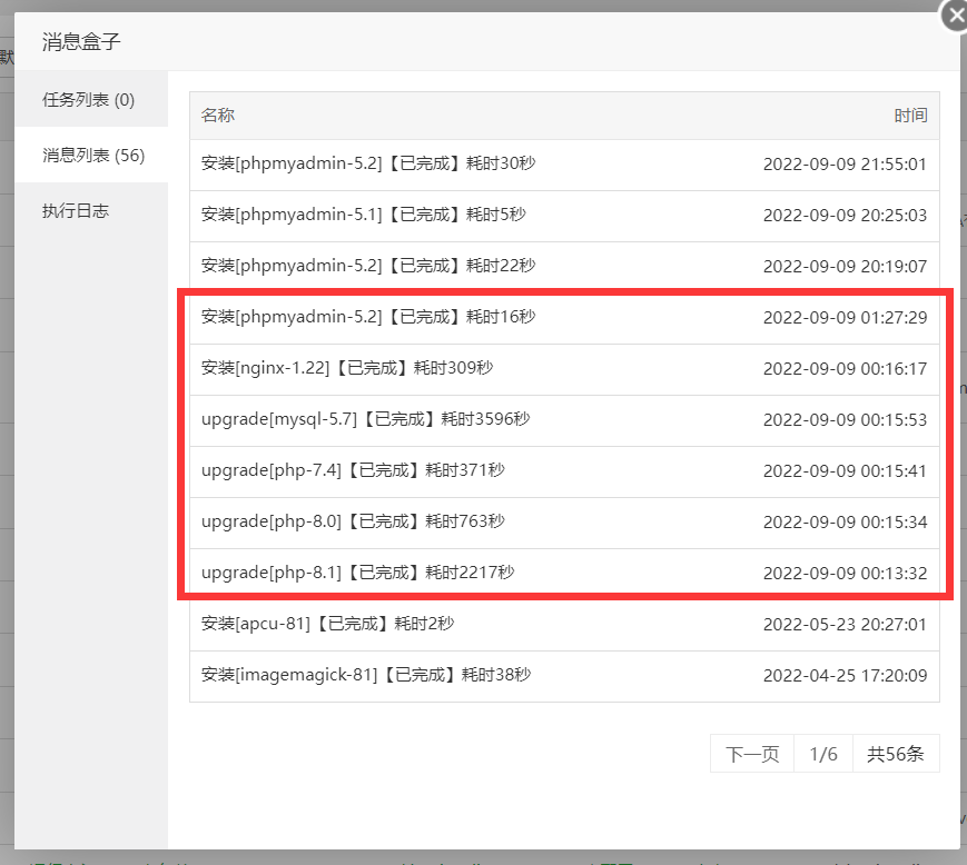 这个问题大概是是从昨晚我更新程序开始的,昨晚我登录到我服务器的宝塔面板,看到软件商店里面web组件有更新,于是我就顺手把它们都更新了,我启动了三个版本的PHP(7.4、8.0、8.1)的更新,还切换了nginx版本(1.21改1.22),同时还更新了MySQL,这些组件我当初从宝塔安装的时候选的是”编译安装“,所以后续的更新都是由宝塔面板自动排队编译安装的,最开始我没太当回事毕竟我经常更新组件