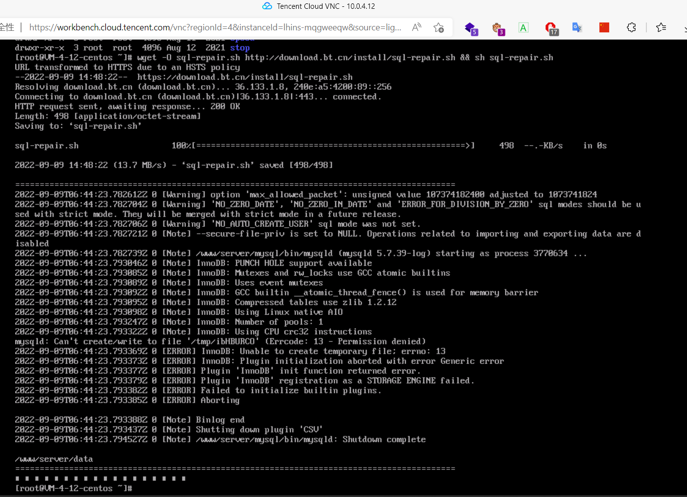 我最开始也没想那么多,以外只是简单的oom,毕竟服务器ram就那么点,就上宝塔面板去启动MySQL,结果开不起来,报错说是/tmp/mysql开头的一个sock文件找不到,我也没想那么多,既然文件没了那就去创建,复制了报错中的完整文件路径去命令行touch它,结果touch命令也报找不到这个文件,然后我用ll命令看了下才知道,是整个/tmp目录都没了,然后我就直接mkdir /tmp,然后再去touch那个文件,之后再去启动MySQL,又收获新的报错,大意是权限问题,上网查找方案,用了宝塔的修复脚本,结果还是报错